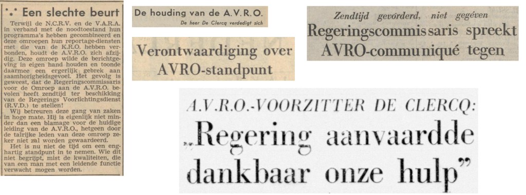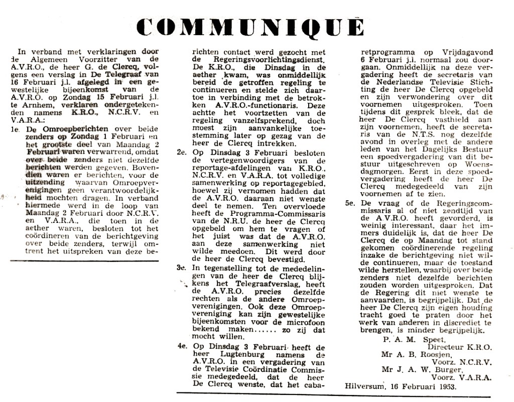 Misschien is het een woordenspel: betekent het ‘onder voorwaarden afstaan’ van zendtijd hetzelfde als ‘weigeren om vrijwillig zendtijd te geven’? Voorzitter De Clerq zegt dat hij -anders dan de voorwaarde dat de AVRO de berichten eerst mocht keuren- de regering geen strobreed in de weg legde. “Elke andere houding van het A.V.R.O. bestuur zou misdadig geweest zijn!” Er is dan ook geen conflict, zegt De Clerq. In het omroepblad De Radiobode van 15 februari 1953 schrijft de omroep dat ze “met grote verontwaardiging” kennis neemt van anti-AVRO- sentimenten.