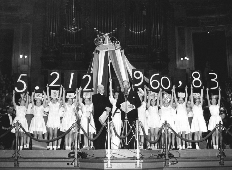 Slotavond Beurzen Open, Dijken Dicht. Overdracht van het eindbedrag door Prof. Dr. J.B. Kors (gesloten boord), naast hem Hr. Schokking. Kinderen met Provincie wapens steken borden met getallen omhoog. Foto: ANP Foto.