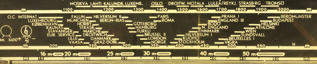 Geen frequenties maar namen. Als je in vroeger tijden de radio afstemt, dan zoek je naar de naam van de plaats waar de zender staat. Handig! Bij zowat elke radio-van-toen staat een Zwitserse plaats aan het begin of eind van de zenderschaal (afhankelijk van het toestel): Beromünster.