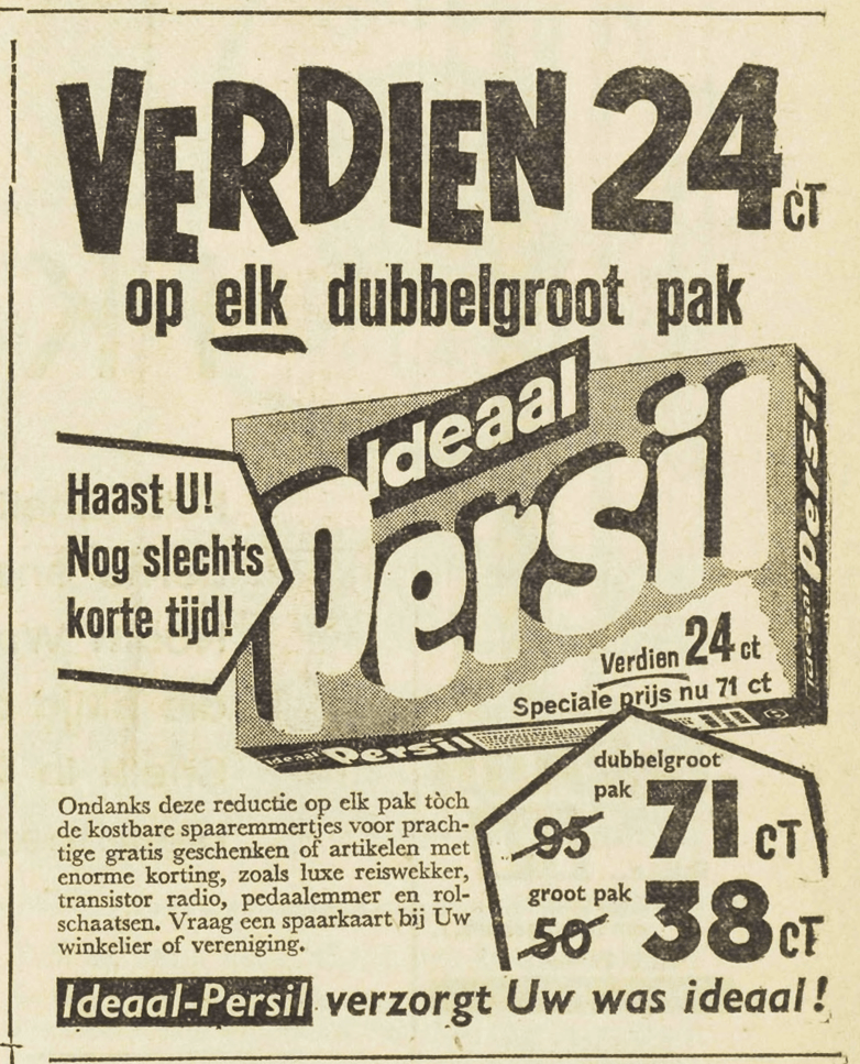 Huisvrouwen sparen in de jaren ’60 heel wat bij elkaar, zoals pannen, soepkommen, rolschaatsen en radio’s. In het tijdschrift Ariadne over reclame (17 januari 1967), staat een overzicht van verschillende spaaracties.
