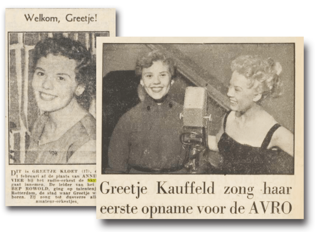 Wat Greetje Kauffeld doet is nieuws voor de kranten. Zo meldt de Volkskrant op 9 januari 1957 dat de Skymasters een nieuwe zangeres hebben (linkerfoto hieronder). Het Algemeen Dagblad schrijft op 23 januari 1957 over de opnamedag van Greetje met de Skymasters (rechterfoto, met links Greetje Kauffeld en rechts zangeres Billy Anthony). De eerste uitzending is op 1 februari 1957.