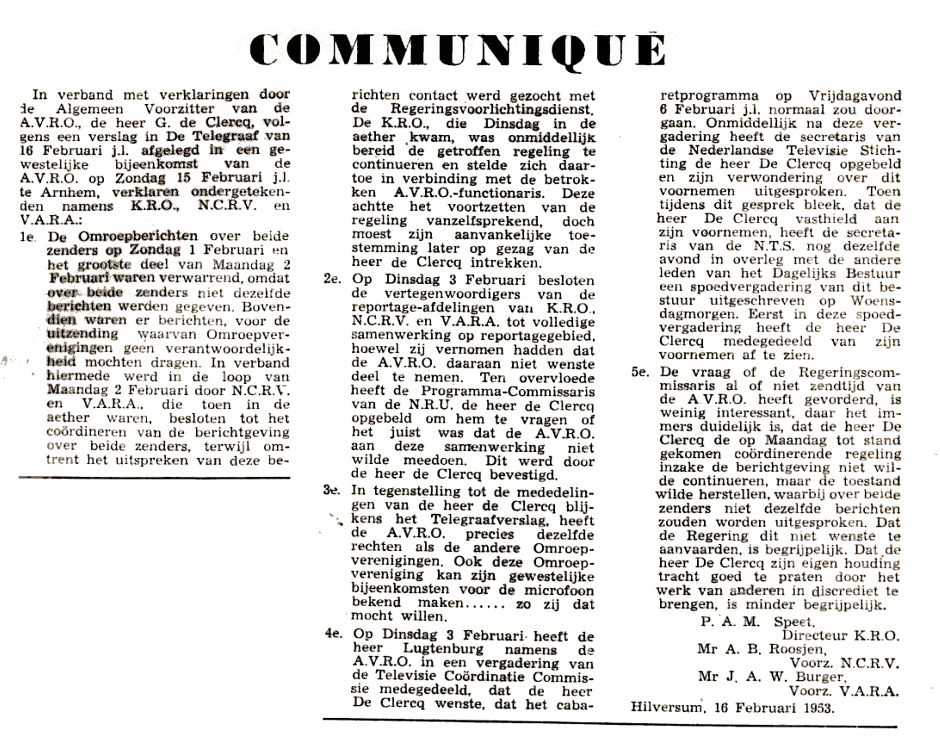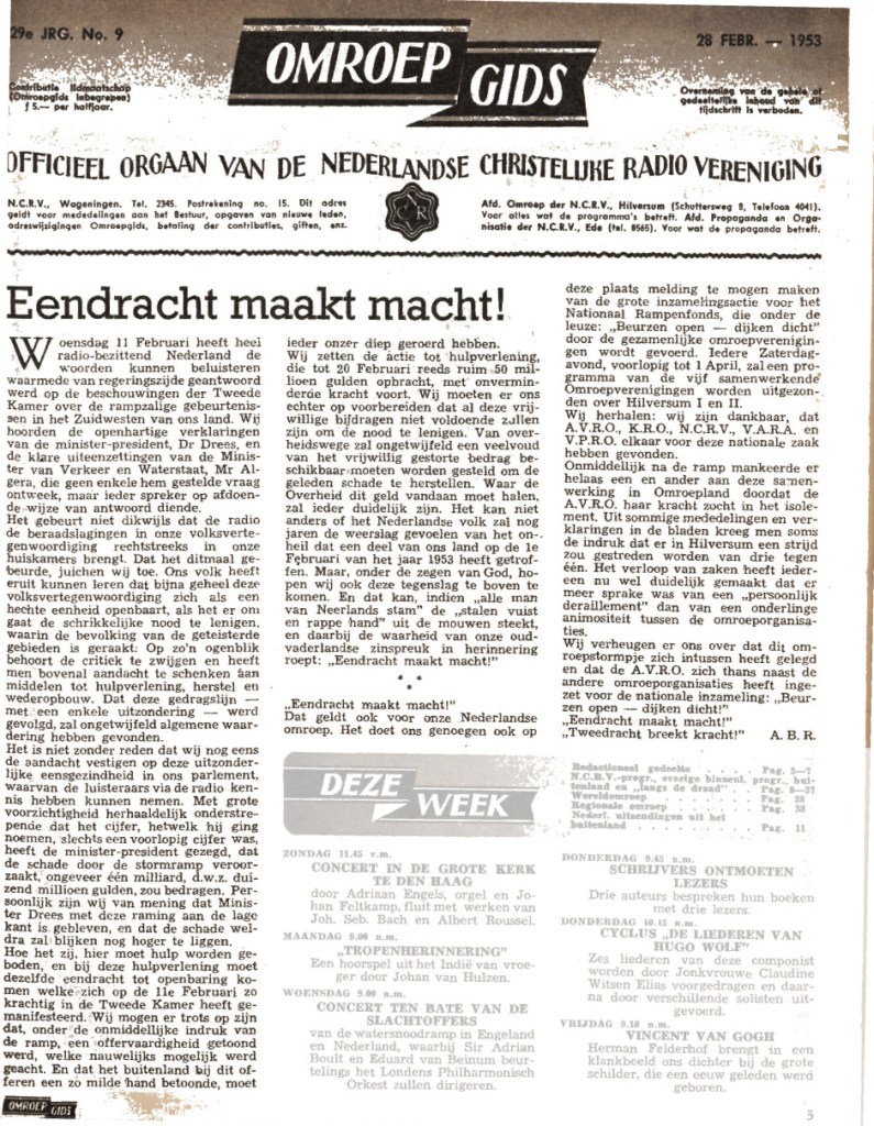 Na de Watersnoodramp van 1953 schrijven de programmabladen van de omroepen VARA, AVRO, KRO, NCRV en VPRO over hun rol bij de berichtgeving op de radio. Hun conclusie: de omroepen deden het goed en de radio was hét nieuwsmedium bij uitstek. Maar: er is ook een rel. De AVRO wil aanvankelijk niet meewerken aan gezamenlijke uitzendingen. Het levert een rel op die zelfs tot in de Tweede Kamer tot vragen leidt.