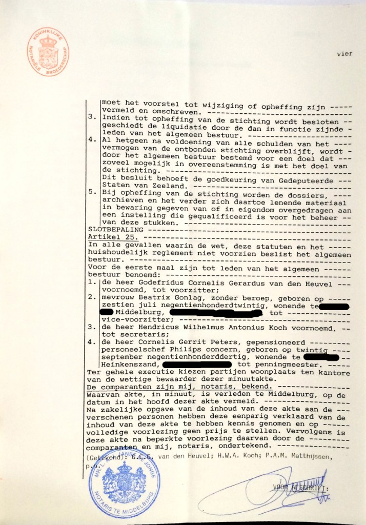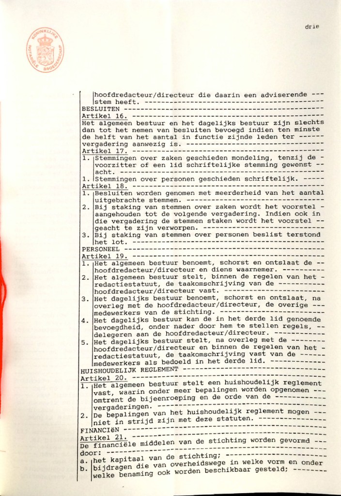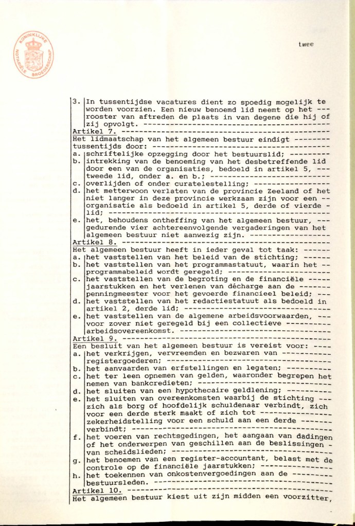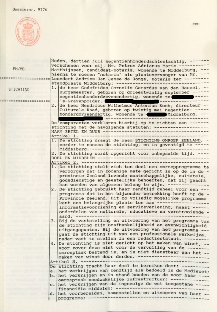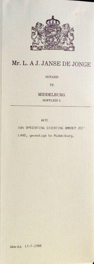 Oprichtingsakte Na jaren voorbereiden, lobbyen en politieke strijd wordt de Stichting Omroep Zeeland opgericht op 13 juli 1988. In de oprichtingsakte staat wat de omroep wil en hoe de verantwoordelijkheden zijn verdeeld. Dit delen: Delen op X (Opent in een nieuw venster) X Share op Facebook (Opent in een nieuw venster) Facebook Delen op LinkedIn (Opent in een nieuw venster) LinkedIn Delen op Telegram (Opent in een nieuw venster) Telegram Delen op WhatsApp (Opent in een nieuw venster) WhatsApp E-mail een link naar een vriend (Opent in een nieuw venster) E-mail Vind-ik-leuk Aan het laden...
